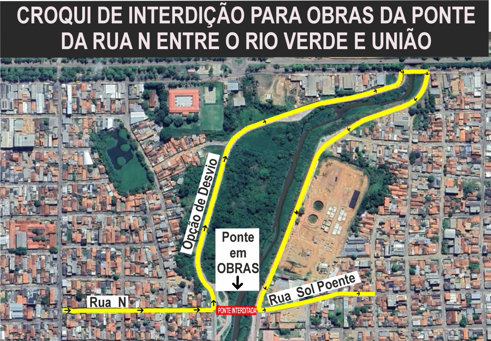 A partir do próximo domingo, dia 25, o trânsito da Rua Sol Poente será desviado pela Rua 20, seguindo até a Avenida Liberdade, com retorno pela Avenida Ilha do Coco, acessando novamente a Rua Sol Poente. A rota alternativa, planejada pelo Departamento Municipal de Trânsito e Transporte (DMTT), será necessária em virtude das obras de demolição e reconstrução da ponte da Rua Sol Poente, que liga os bairros Rio Verde e União.