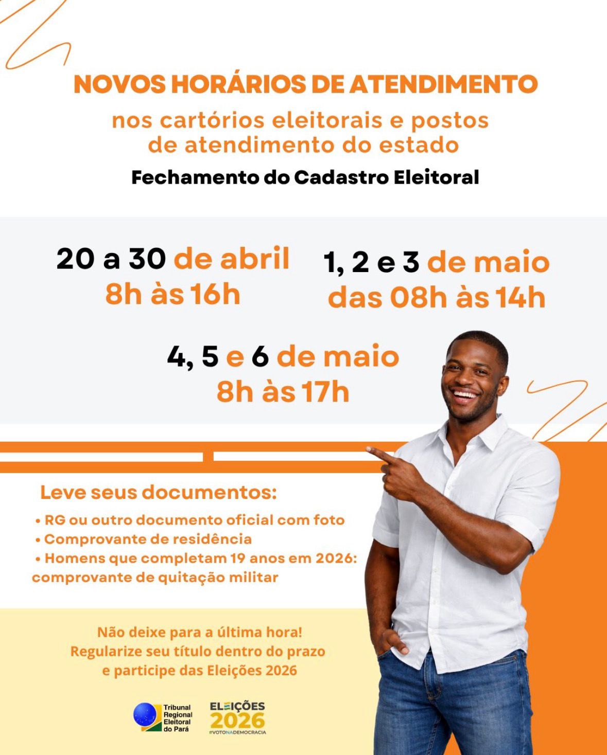 Com a proximidade do prazo final para regularização do título de eleitor, o Tribunal Regional Eleitoral do Pará (TRE-PA) anunciou a ampliação dos horários de atendimento nos cartórios eleitorais e postos do estado. A medida tem como objetivo facilitar o acesso da população aos serviços e garantir que todos os eleitores possam participar das Eleições 2026.