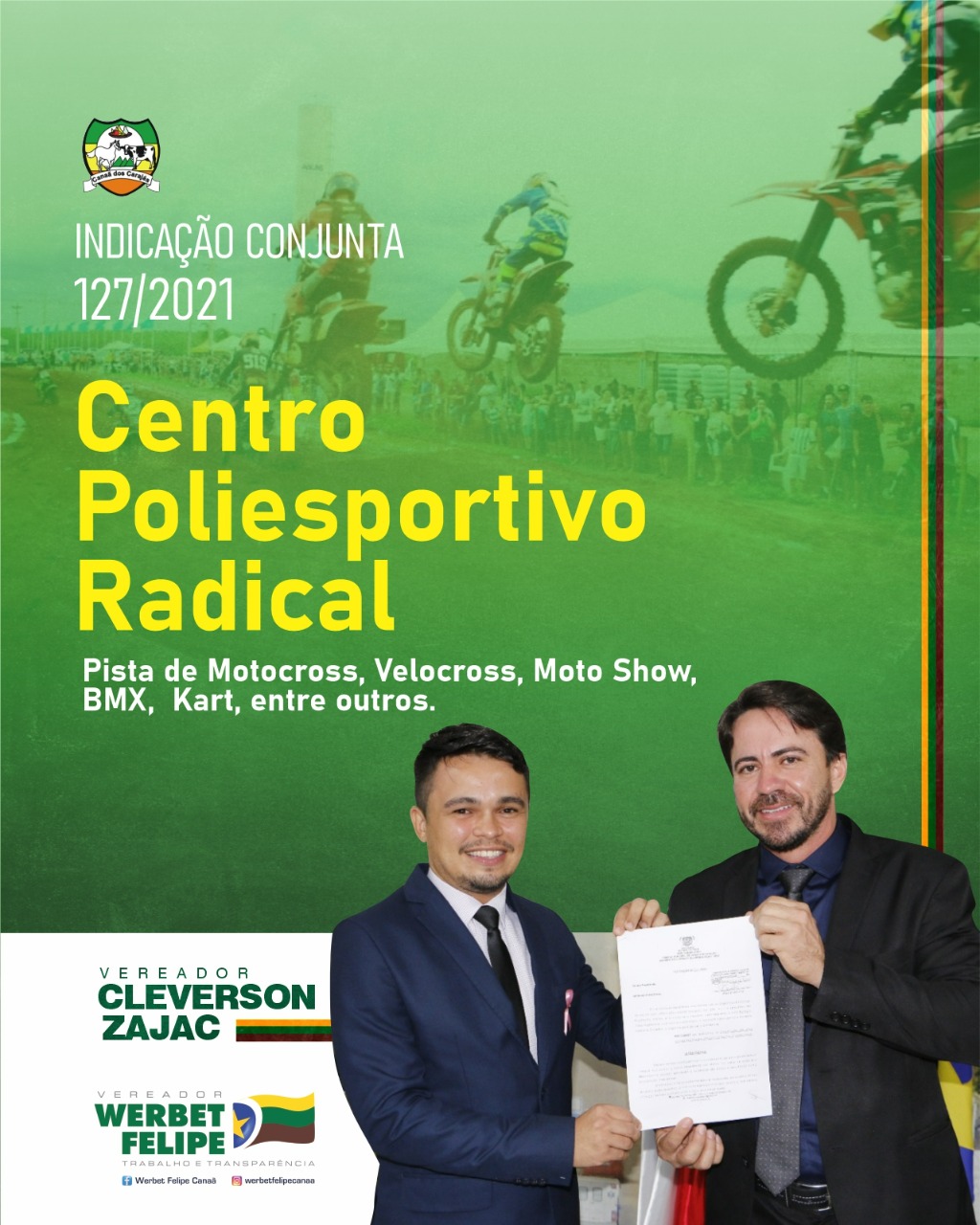 Na indicação conjunta Nº 127/2021, apresentada na noite desta terça-feira, 26, durante a 35ª Sessão Ordinária, os parlamentares solicitaram ao Poder Executivo a Construção de um Centro Poliesportivo Radical com pista para motocross, velocross, moto show, ciclismo BMX (esporte praticado com bicicletas especiais) e Kart.