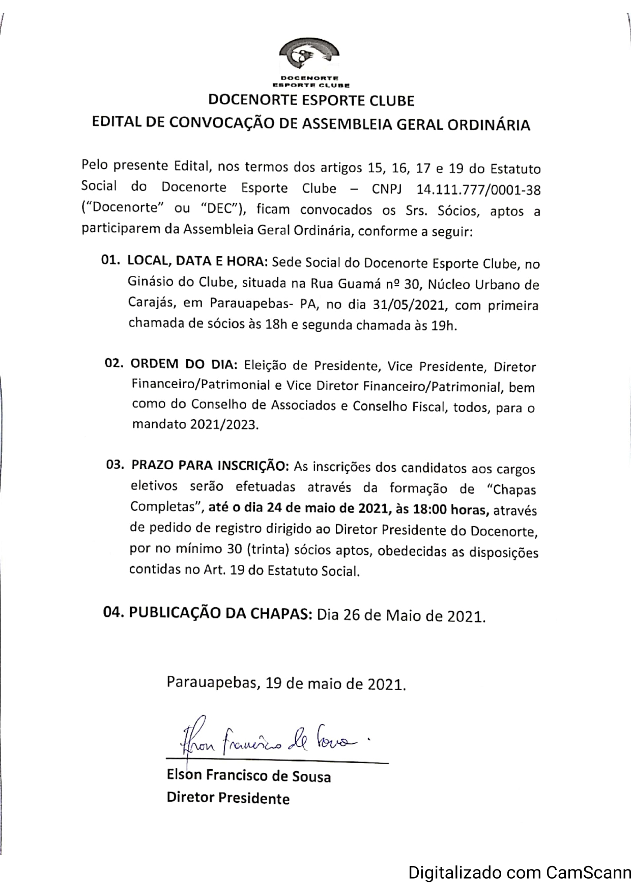 O Estatuto Social do Docenorte Esporte Clube com CNPJ – 14.111.777/0001-38, pelo presente edital nos termos dos artigos, 15, 16, 17 e 19, vem convocar os Srs. Sócios, aptos a participar da Assembleia Geral Ordinária, sendo a mesma realizada na Sede Social do Docenorte Esporte Clube, no ginásio do clube, situado na Rua Guamá N°30, Núcleo Urbano de Carajás em Parauapebas, no dia 31/05/2021 com primeira chamada de sócios às 18h e segunda chamada às 19h.