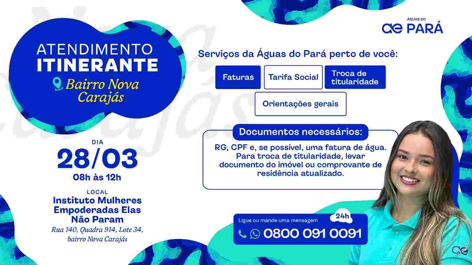 Moradores do bairro Nova Carajás, em Parauapebas, terão a oportunidade de emitir a segunda via das contas de água durante uma ação de atendimento itinerante da Águas do Pará, que acontece neste sábado (28), das 8h às 12h.