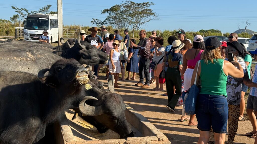 A proximidade com os búfalos, conhecidos por sua docilidade, foi um dos pontos altos do passeio. Para muitos, a visita foi a primeira oportunidade de interagir de perto com esses animais. A geógrafa aposentada Nicácia Rodrigues de Oliveira, de 82 anos, veio de Goiânia (GO) e estava encantada. “Eu já vi búfalos em outros lugares, inclusive em outros países, mas nunca cheguei assim tão pertinho. Eu estou amando esse passeio, estou adorando. Na verdade, eu queria andar de búfalo”, disse com bom humor.