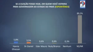 Outro dado relevante foi a percepção dos eleitores sobre quem será o próximo governador do Pará, independentemente da sua própria escolha. Nesse quesito, 32% apontaram Hana Ghassan como favorita, 25% acreditam em Dr. Daniel, 6% disseram que ninguém vencerá ou que votarão em branco/nulo, enquanto 37% não souberam responder.