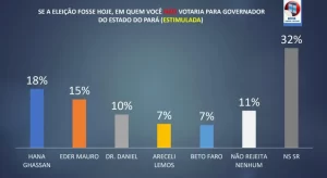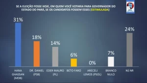 No cenário estimulado, quando os nomes dos pré-candidatos são apresentados, os números mudam de forma significativa. Hana Ghassan lidera com 31% das intenções de voto, seguida por Dr. Daniel, com 18%, e Eder Mauro, com 14%. Em seguida aparecem Beto Faro, com 6%, e Araceli Lemos, que não pontuou. Os eleitores que disseram votar em branco ou nulo somaram 7%, enquanto 24% preferiram não responder.