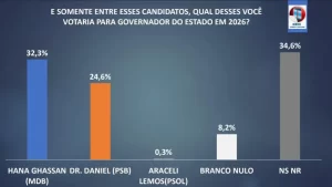 Quando a escolha foi afunilada para apenas alguns nomes, Hana Ghassan ampliou a vantagem e aparece com 32,3%, contra 24,6% de Dr. Daniel. Já Araceli Lemos obteve 0,3%. Brancos e nulos somaram 8,2% e indecisos chegaram a 34,6%.