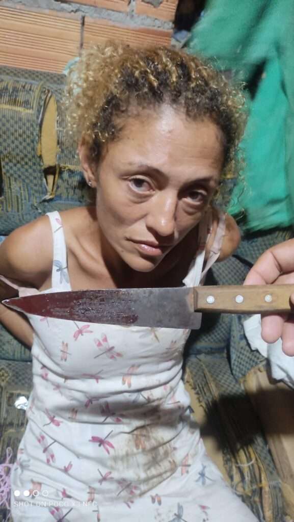 Na ocasião, foi colhida informações do morador vizinho da vítima, ora conhecido como “IVO”, o qual relatou que autora do esfaqueamento havia sido a namorada da vítima, a qual é usuária de entorpecentes, revelando, ainda, que a autora estava nas imediações da casa da vítima, de imediato, foi encetada diligencia ao local foi logrado êxito em sua prisão, onde foi identificada preliminarmente como MIRIAN FERREIRA DA SILVA, inclusive, apresentava sinais visíveis de estado entorpecida, sendo apreendido na posse da autora a faca tipo peixeira, cabo em madeira, arma utilizada para golpear a vítima, foi necessário uso de algemas a fim de manter a integridade física da equipe da GM e da autora que apresentava corte recente na palma da mão direita, ato contínuo, a autora foi conduzida e apresentada a Unidade Policial para as formalidades de direito.