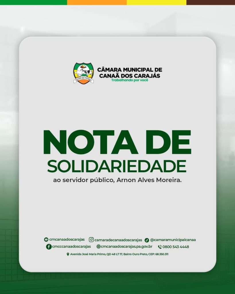 A Câmara Municipal de Canaã dos Carajás, por meio de sua Direção, manifesta irrestrita solidariedade ao servidor público Arnon Alves Moreira, em razão dos lamentáveis fatos ocorridos no dia 24 de junho de 2025, enquanto desempenhava suas atribuições funcionais.