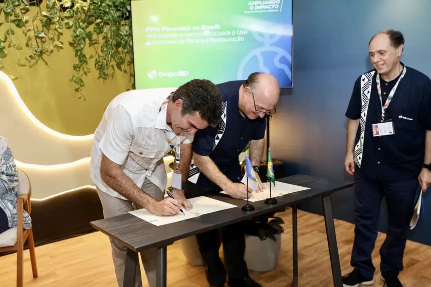 O governador do Pará, Helder Barbalho, e o presidente do Banco Interamericano de Desenvolvimento (BID), Ilan Goldfajn, celebraram nesta quarta-feira (12), a primeira garantia de banco multilateral para restauração florestal no Brasil. O anúncio, seguido de assinatura do documento que garante a operação, ocorreu durante o painel “Parcerias Público-Privadas Florestais no Brasil: destravando investimentos para o uso sustentável da terra e a restauração”, na Blue Zone da COP30, em Belém.