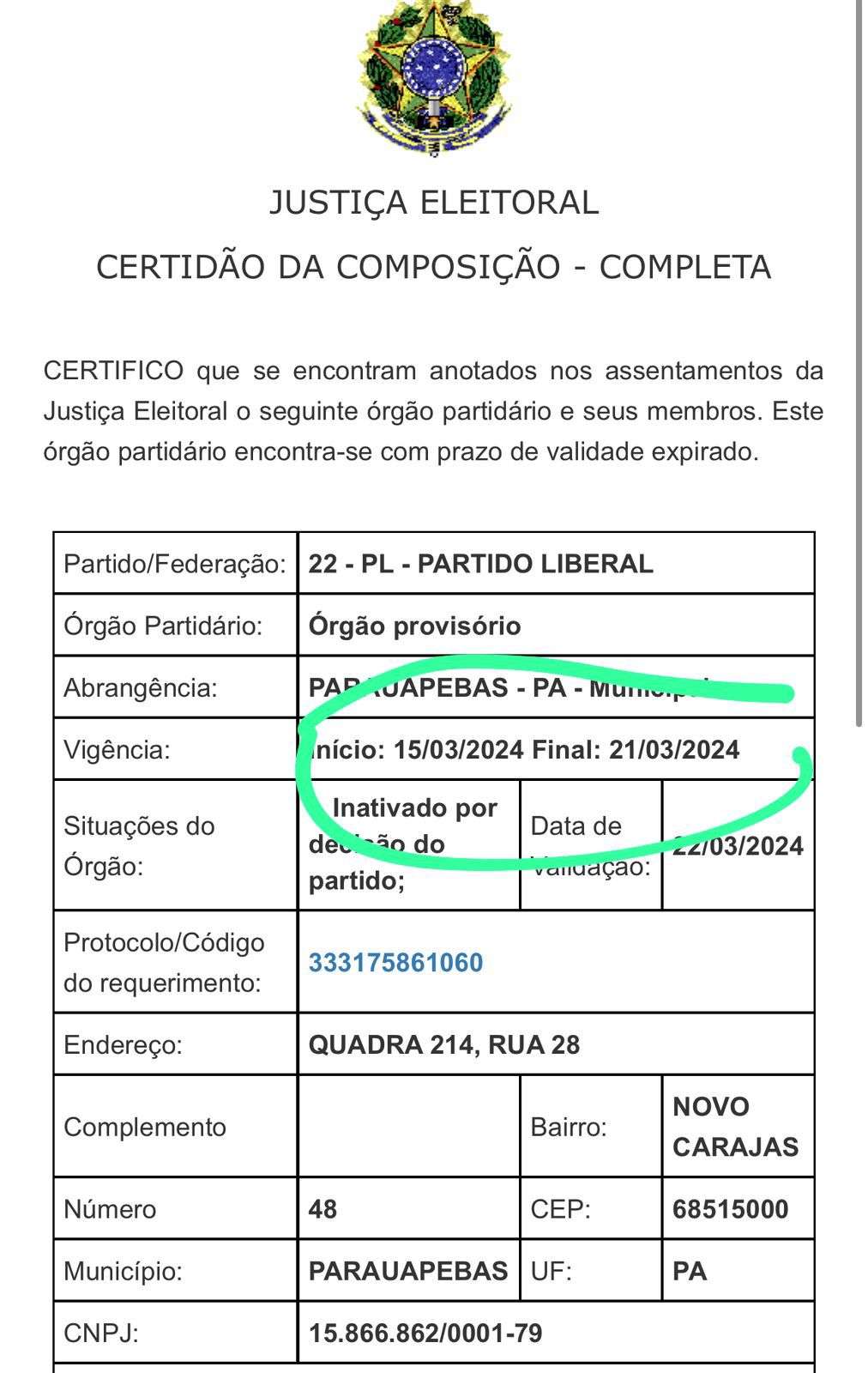 O site da Justiça Eleitoral confirma que a diretoria do PL de Parauapebas, presidida por Aurélio Goiano e teve seu mandato extinto em 21 de março. A Certidão da Composição do PL Parauapebas, emitida pela Justiça Eleitoral, revela que os membros empossados recentemente, incluindo Aurélio, constam como inativos.