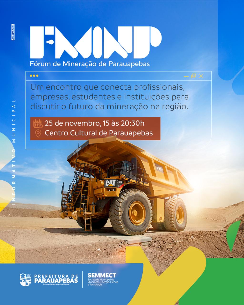 A Prefeitura de Parauapebas, por meio da Secretaria Municipal de Mineração, Energia, Ciência e Tecnologia (Semmect), anuncia a realização da segunda edição do Fórum de Mineração de Parauapebas (FMINP), evento estratégico que reúne governo, empresas, especialistas, acadêmicos e instituições parceiras para discutir caminhos sustentáveis para o setor mineral em Carajás, a maior província mineral do planeta. O fórum será realizado na próxima terça-feira, 25, das 15h às 20h30, no Centro Cultural de Parauapebas, localizado no bairro Alvorá.