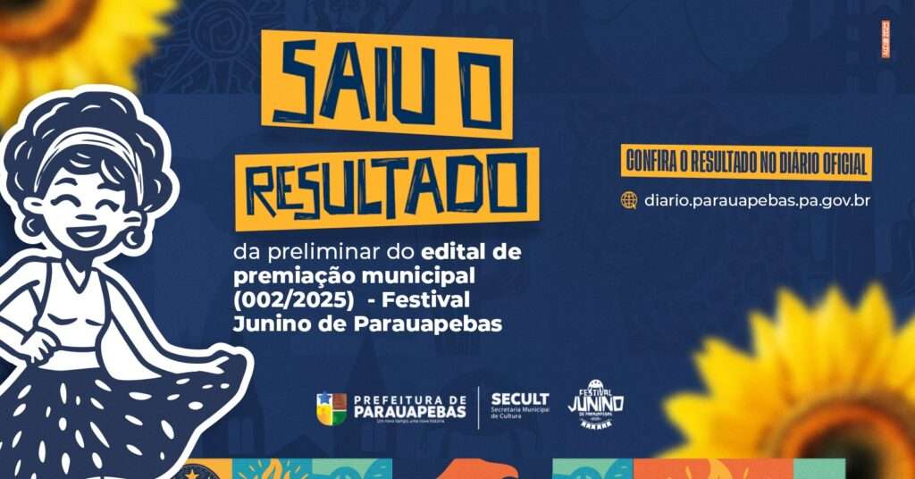 A Prefeitura de Parauapebas, por meio da Secretaria Municipal de Cultura (Secult), divulgou no Diário Oficial da sexta-feira, 27, o resultado preliminar do Edital de Premiação Municipal n° 002/2025, referente ao Festival Junino do município. Acesse diario.parauapebas.pa.gov.br e confira a lista com os classificados.