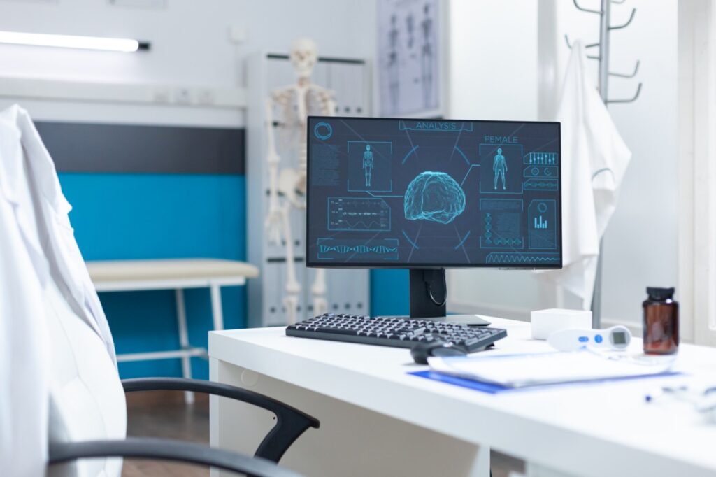 Computer standing on desk in empty bright clinical office having body radiography on screen during medical consultation. Hospital room equipped with professional examination tools. Anatomical skeleton