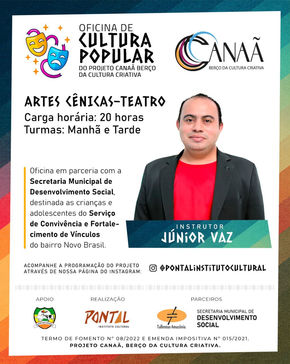Mais informações, você poderá obter pelo contato via WhatsApp em (94) 98434-9148 – Jairon Gomes e em nossas divulgações pelas redes sociais do @pontalinstitutocultural. O projeto conta com o apoio da Prefeitura Municipal de Canaã dos Carajás via Termo de Fomento Nº 08/2022 e Emenda Impositiva Nº 015/2021. Conta ainda com a parceira da empresa Tallentus Amazônia e Secretaria Municipal de Desenvolvimento Social.