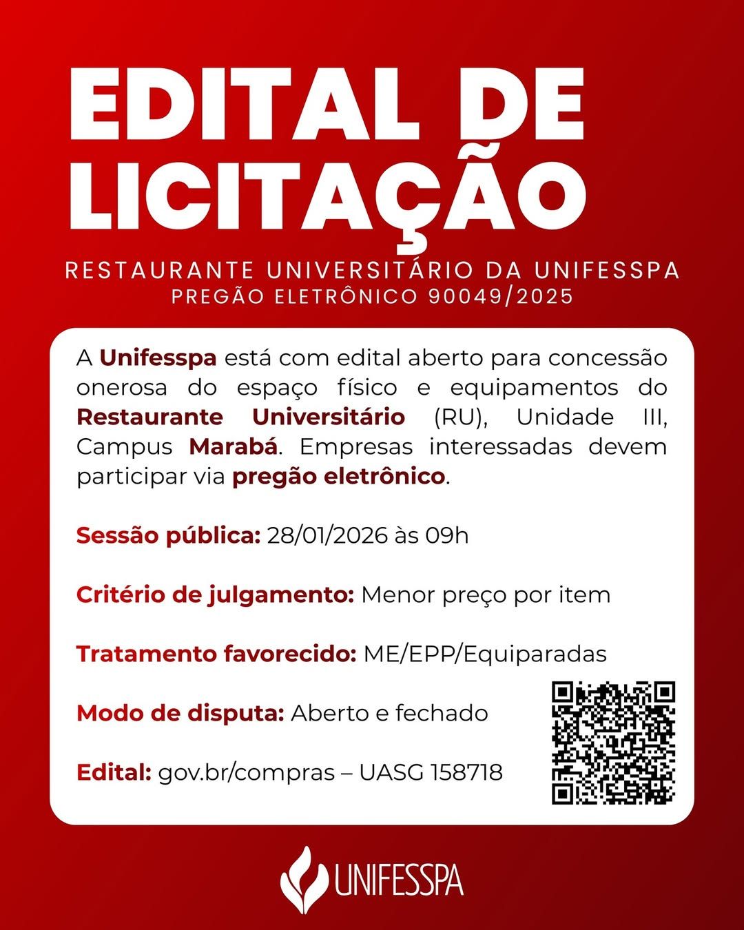 A Universidade Federal do Sul e Sudeste do Pará (Unifesspa) publicou o Edital do Pregão Eletrônico nº 90049/2025, que trata da concessão de uso onerosa do espaço físico e dos equipamentos básicos do Restaurante Universitário (RU) da Unidade III do Campus Marabá. A sessão pública está marcada para o dia 28 de janeiro de 2026, às 9h (horário de Brasília), e ocorrerá por meio do sistema Compras do Governo Federal (Compras.gov.br).