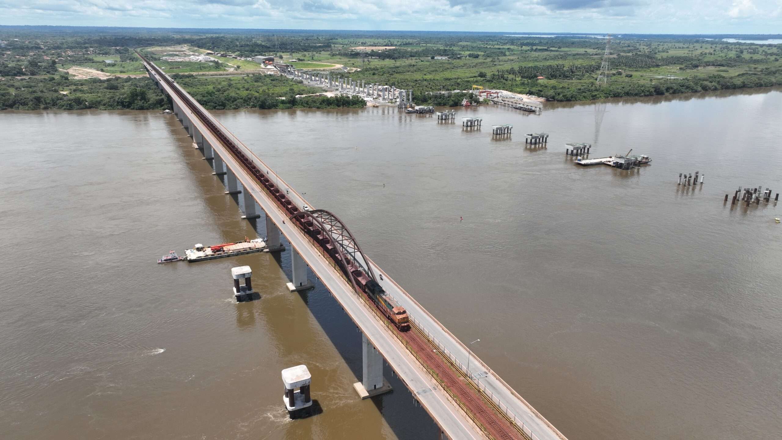 As maiores pontes em construção no Brasil atingiram 58% de execução física. Trata-se das duas estruturas sobre o Rio Tocantins, em Marabá (PA), que seguem avançando com o lançamento dos módulos dos vãos nas duas margens. Executado pela Vale e com investimento total previsto de R$4,1 bilhões, o projeto impressiona quem passa pela ponte rodoferroviária existente.