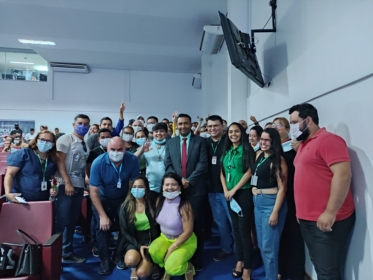Servidores públicos presentes na 3° sessão ordinária, tiram fotos com vereador Josivaldo da Farmácia.